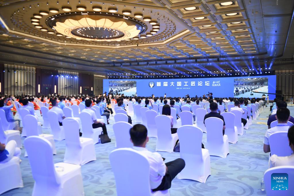 Photo taken on Sept. 2, 2022 shows the opening ceremony of the National Great Craftsman Forum in Changsha, central China's Hunan Province. The first edition of the forum kicked off here on Friday, providing a platform for craftsmen to share experiences and learn from each other. (Xinhua/Xue Yuge)