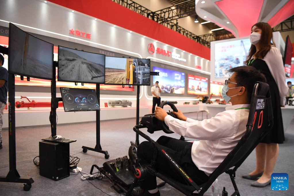 A visitor tries an unmanned vehicle by remote control at an achievement exhibition during the National Great Craftsman Forum in Changsha, central China's Hunan Province, Sept. 2, 2022. The first edition of the forum kicked off here on Friday, providing a platform for craftsmen to share experiences and learn from each other. (Xinhua/Xue Yuge)