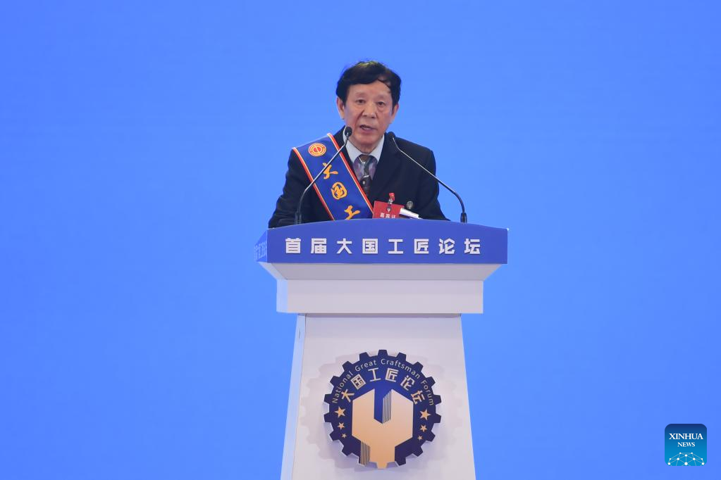 Ai Aiguo, a representative of the national great craftsman, delivers a speech during the opening ceremony of the National Great Craftsman Forum in Changsha, central China's Hunan Province, Sept. 2, 2022. The first edition of the forum kicked off here on Friday, providing a platform for craftsmen to share experiences and learn from each other. (Xinhua/Xue Yuge)