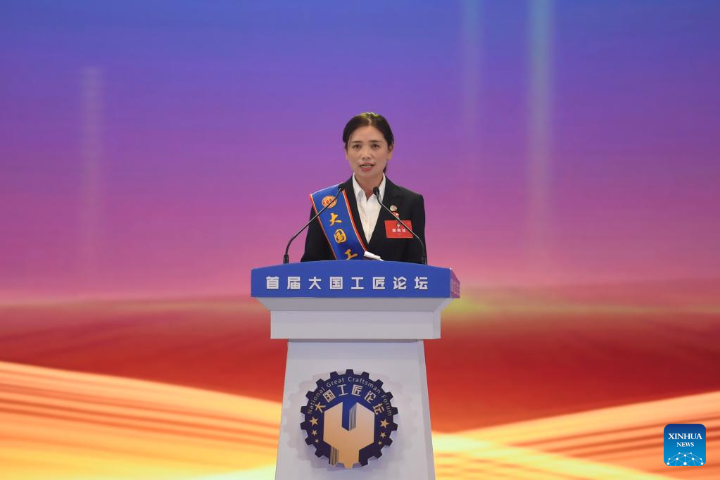 Yi Ran, a representative of the national great craftsman, speaks during the opening ceremony of the National Great Craftsman Forum in Changsha, central China's Hunan Province, Sept. 2, 2022. The first edition of the forum kicked off here on Friday, providing a platform for craftsmen to share experiences and learn from each other. (Xinhua/Xue Yuge)