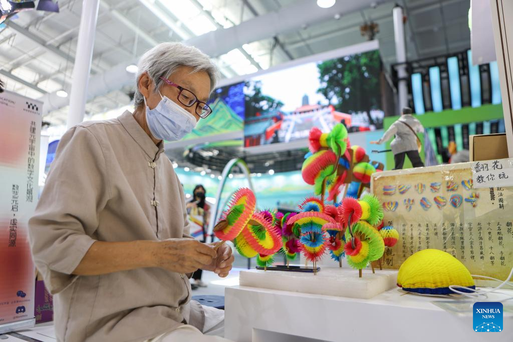 An exhibitor makes paper flowers during the 2022 China International Fair for Trade in Services (CIFTIS) in Beijing, capital of China, Sept. 2, 2022. The 2022 CIFTIS is held in Beijing from Aug. 31 to Sept. 5 at the China National Convention Center and Shougang Park. (Xinhua/Hao Zhao)