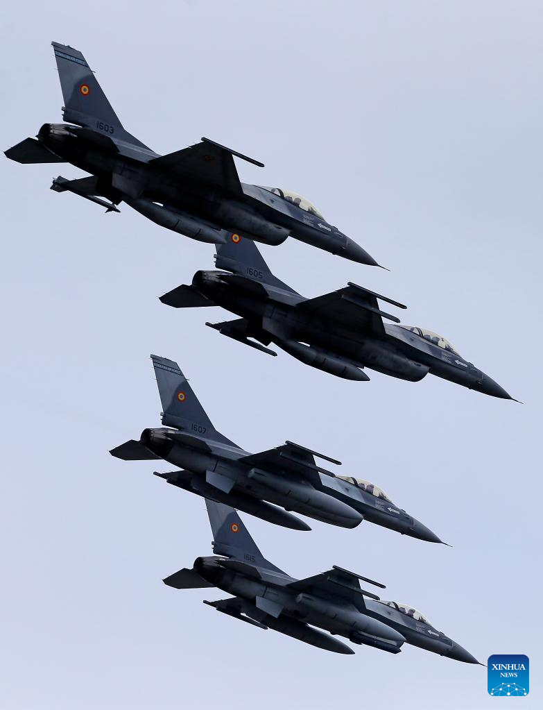 F-16 Fighting Falcon aircrafts perform during Bucharest International Air Show &General Aviation Exhibition in Bucharest, Romania, on Sept. 4, 2022. (Photo by Cristian Cristel/Xinhua)