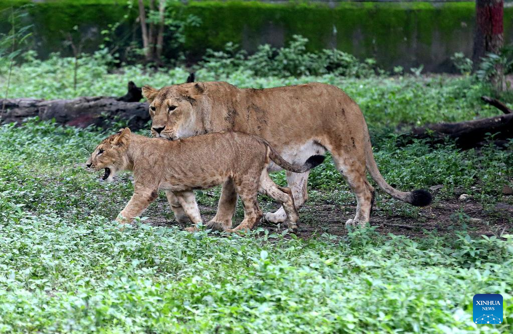 A lioness walks with her cub at Kamla Nehru Zoological Park in Indore, 200 Km from Bhopal, capital of India's Madhya Pradesh state, on Sept. 4, 2022. (Str/Xinhua)