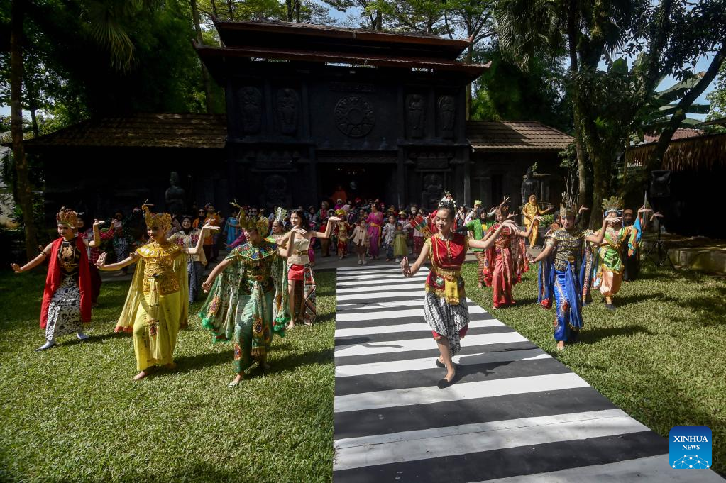People participate in a traditional flash mob dance after a fashion show held at Rumah Budaya Nusantara Puspo Budoyo in South Tangerang, Banten Province, Indonesia, Sept. 4, 2022. (Xinhua/Agung Kuncahya B.)