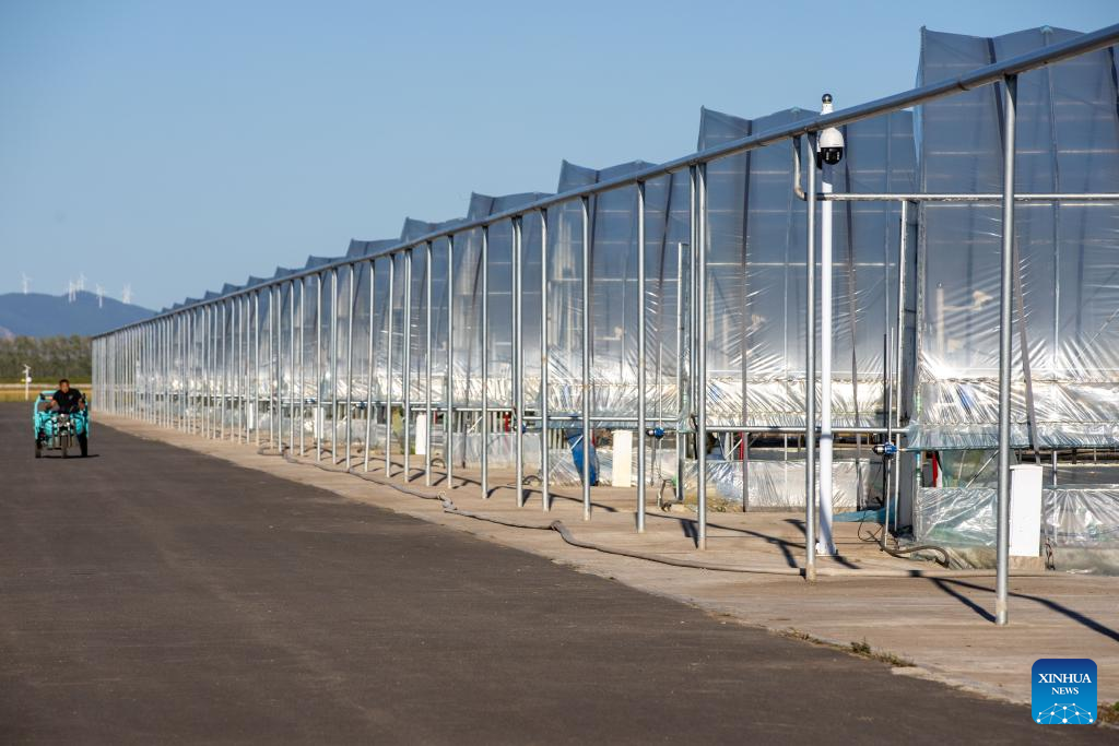 A staff member patrols green houses in a paddy rice technology demonstration park in Fujin City of northeast China's Heilongjiang Province, on Sept. 2, 2022. Cutting-edge information technologies including the Internet-of-Things and cloud-computing have been adopted for breeding management, water-saving irrigation, weather monitoring, grain growth tracking, as well as pest and weed control at the demonstration park to improve both quantity and quality of rice produce. (Xinhua/Zhang Tao)