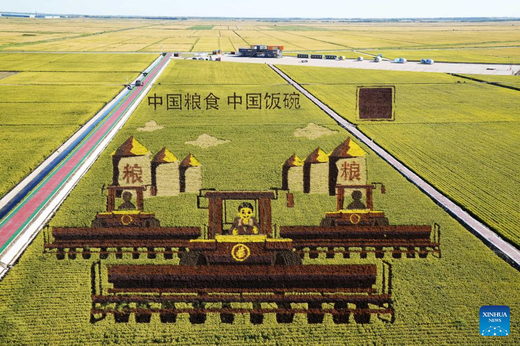 Photo taken on Sept. 2, 2022 shows an art creation made up of living plants of different colors in a paddy rice technology demonstration park in Fujin City of northeast China's Heilongjiang Province. Cutting-edge information technologies including the Internet-of-Things and cloud-computing have been adopted for breeding management, water-saving irrigation, weather monitoring, grain growth tracking, as well as pest and weed control at the demonstration park to improve both quantity and quality of rice produce. (Xinhua/Wang Jianwei)