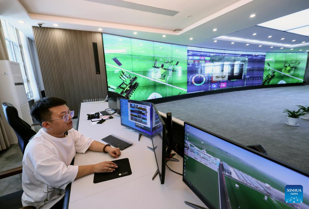 Photo taken on Sept. 2, 2022 shows the modern agricultural information service center of a paddy rice technology demonstration park in Fujin City of northeast China's Heilongjiang Province. Cutting-edge information technologies including the Internet-of-Things and cloud-computing have been adopted for breeding management, water-saving irrigation, weather monitoring, grain growth tracking, as well as pest and weed control at the demonstration park to improve both quantity and quality of rice produce. (Xinhua/Wang Jianwei)