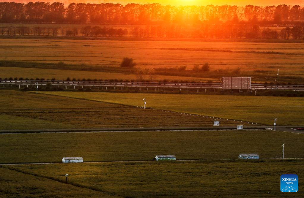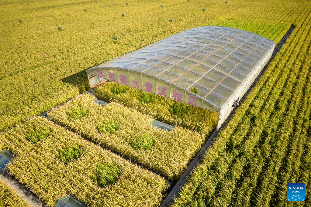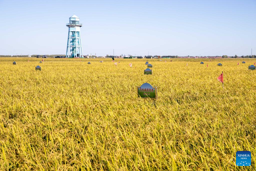 Photo taken on Sept. 2, 2022 shows a field with water-saving and reduced-draining technologies in a paddy rice technology demonstration park in Fujin City of northeast China's Heilongjiang Province. Cutting-edge information technologies including the Internet-of-Things and cloud-computing have been adopted for breeding management, water-saving irrigation, weather monitoring, grain growth tracking, as well as pest and weed control at the demonstration park to improve both quantity and quality of rice produce. (Xinhua/Zhang Tao)