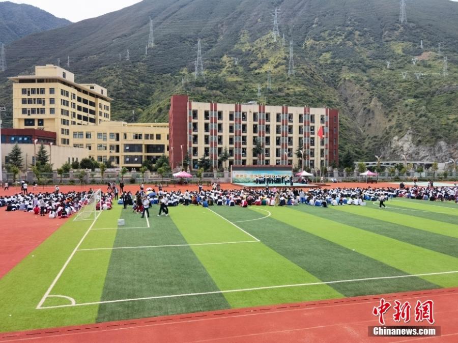 Students are evacuated to a playground after earthquake at Luding county, Ganzi Tibetan autonomous prefecture, southwest China's Sichuan Province, Sept. 5, 2022. (Photo provided to China News Service)