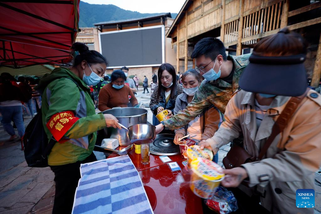 Quake relief supplies are distributed to residents in Moxi Township of Luding County, southwest China's Sichuan Province, Sept. 5, 2022. (Xinhua/Shen Bohan)