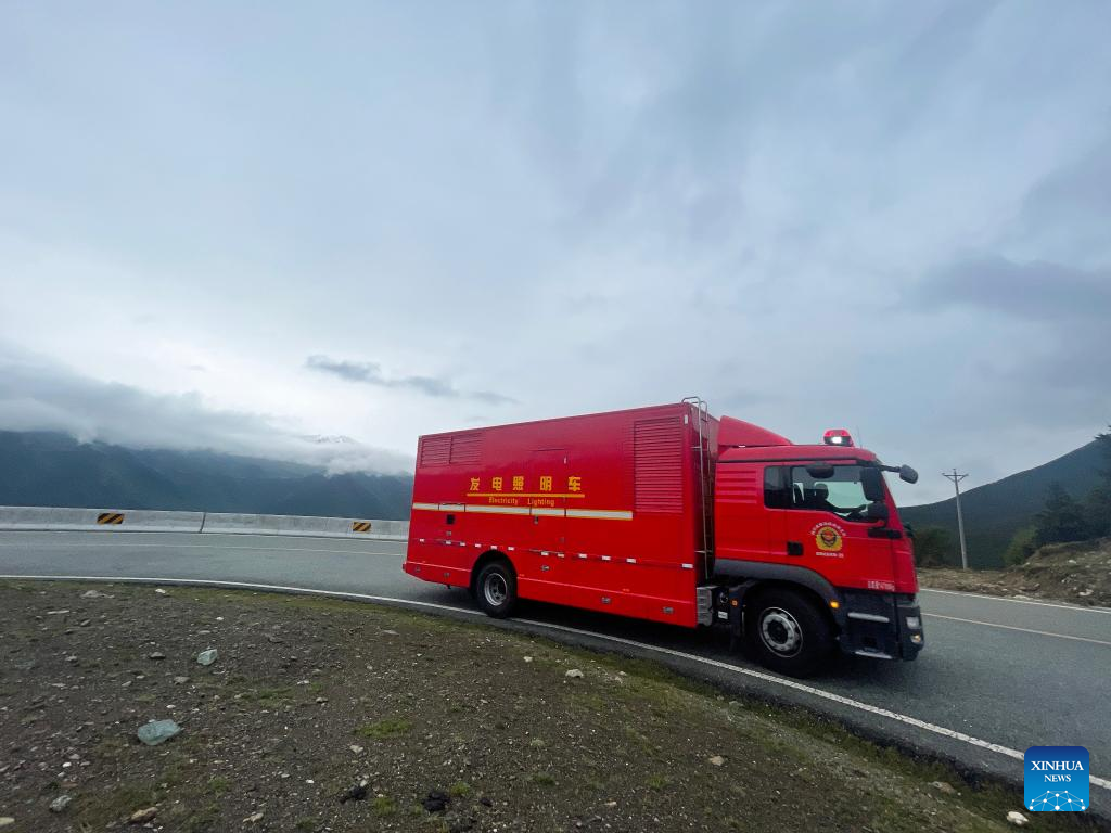 A rescue vehicle is seen on a road as rescue teams head to Luding County in southwest China's Sichuan Province, Sept. 5, 2022. (Xinhua/Shen Bohan)