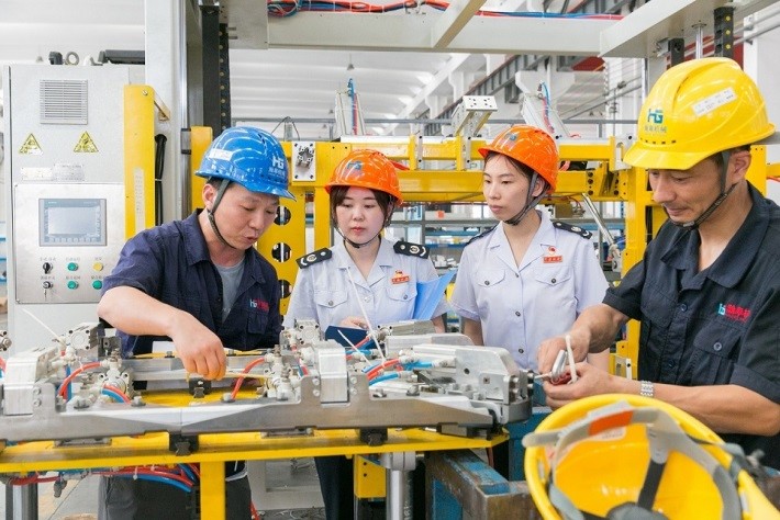 Tax officers gain information about sci-tech innovations made by a high-tech company in Rugao city, east China's Jiangsu province, and provide guidance for the company on enjoying relevant tax-and-fee policies designed to support enterprises, August 2022. (People's Daily Online/Xu Hui)