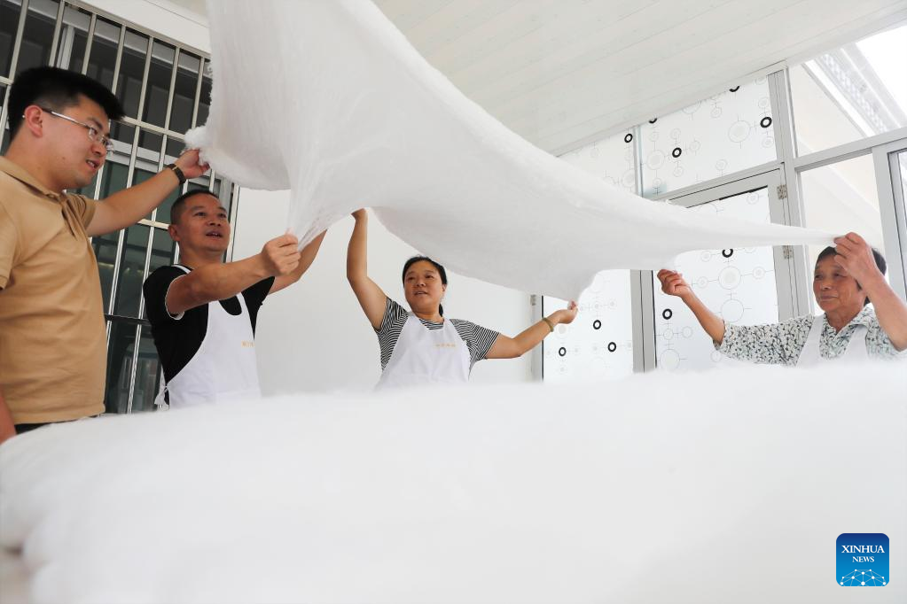 Workers make silk quilts at a workshop of a silk company in Yuexi County, east China's Anhui Province, Sept. 4, 2022.