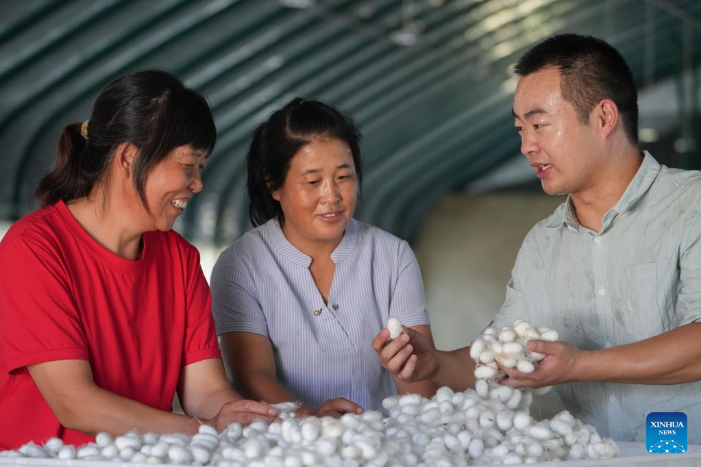 The cultivation of mulberry trees and breeding of silkworms industry is one of the major pillar industries in Yuexi County, east China's Anhui Province. Mulberry trees cover an area of 80,000 mu (about 5,333 hectares) with 16,700 households breeding silkworms in the county. In 2021, silkworm farmers earned 262 million yuan (about 37.79 million U.S. dollars) from selling cocoons.