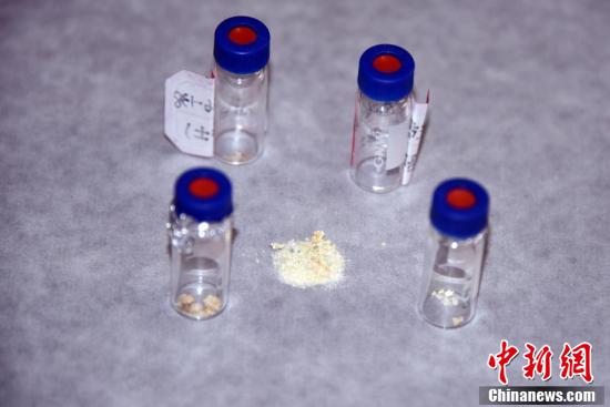 Han Bin, special research assistant of the University of Chinese Academy of Sciences, handles samples of the residues of synthetic white lead cosmetics found in a bronzeware excavated from a tomb in Liangdai village, northwest China's Shaanxi Province. (China News Service/Sun Zifa)