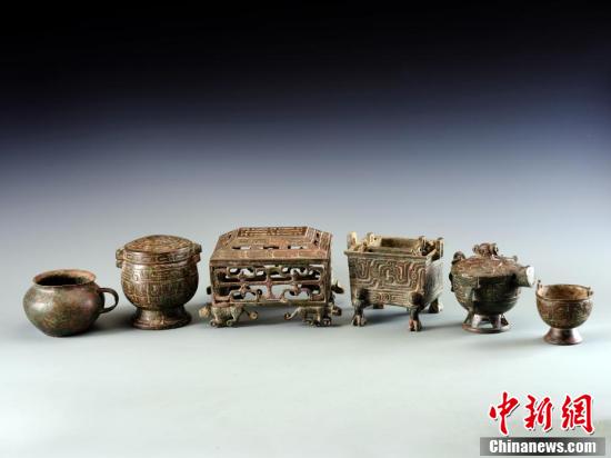 Photo shows bronzewares excavated from an ancient tomb (M26) at the ruins of the Rui State in the Spring and Autumn Period (770 BC-476 BC) in Liangdai village, northwest China's Shaanxi Province. (Photo courtesy of the Rui State Ruins Museum of Liangdai Village)