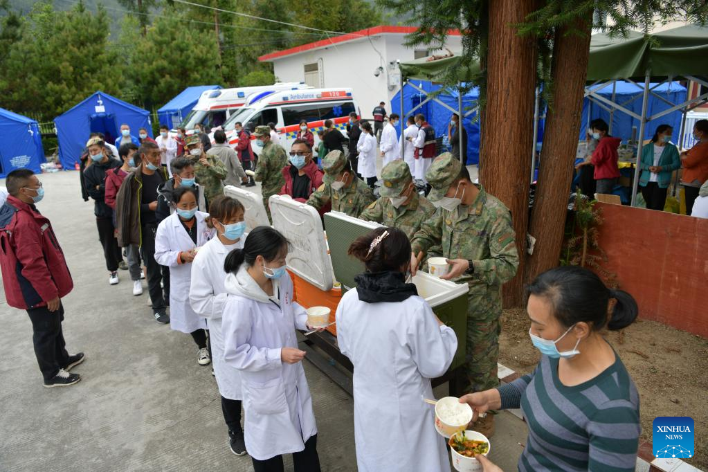 Food are distributed to rescuers and quake-affected residents in Moxi Town of Luding County, southwest China's Sichuan Province, Sept. 6, 2022.
