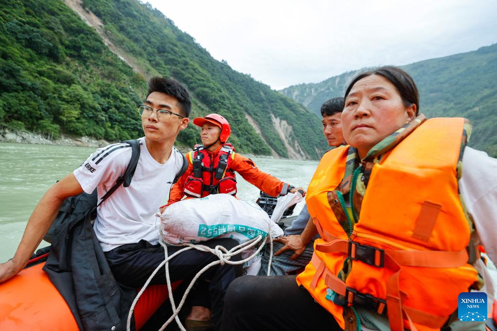 Villagers take a rubber boat during an evacuation from Detuo Town in Luding County, southwest China's Sichuan Province, Sept. 6, 2022.