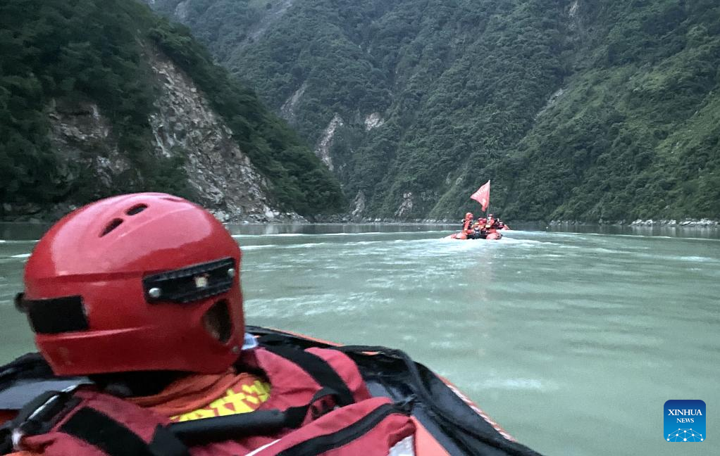 Rescuers take a rubber boat to Ziyachang Village of Detuo Town in Luding County, southwest China's Sichuan Province, Sept. 6, 2022.
