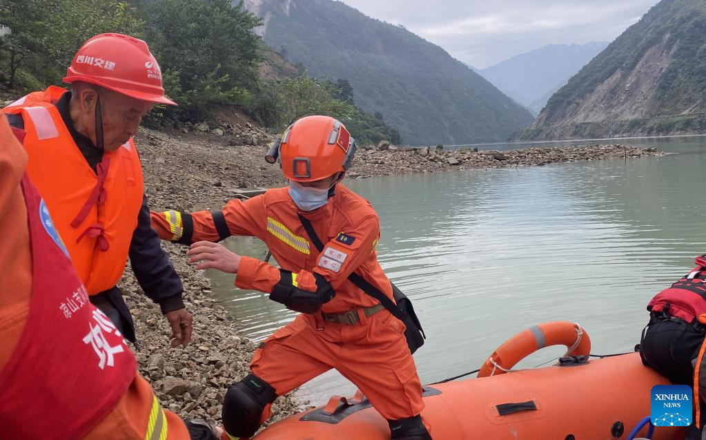 Rescuers prepare to head to Wandong Village of Detuo Town by boat, in Luding County, southwest China's Sichuan Province, Sept. 6, 2022.