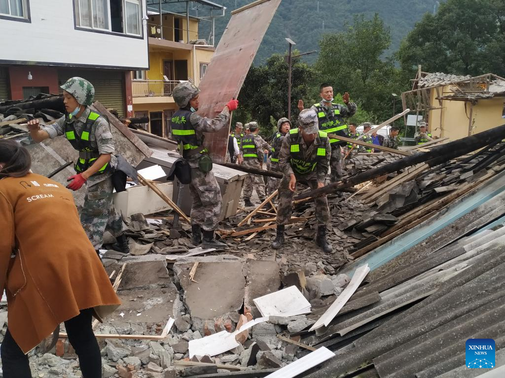 Rescue workers clear the debris from the houses in Moxi Town of Luding County, southwest China's Sichuan Province, Sept. 6, 2022.