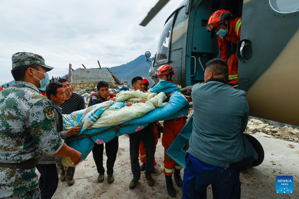 Rescuers transfer a resident injured during an earthquake via a helicopter in Gonghe Village of Moxi Town in Luding County, southwest China's Sichuan Province, Sept. 6, 2022.