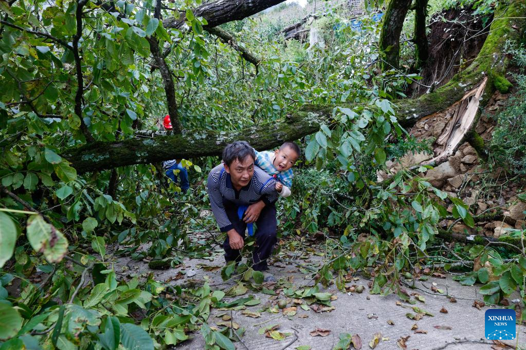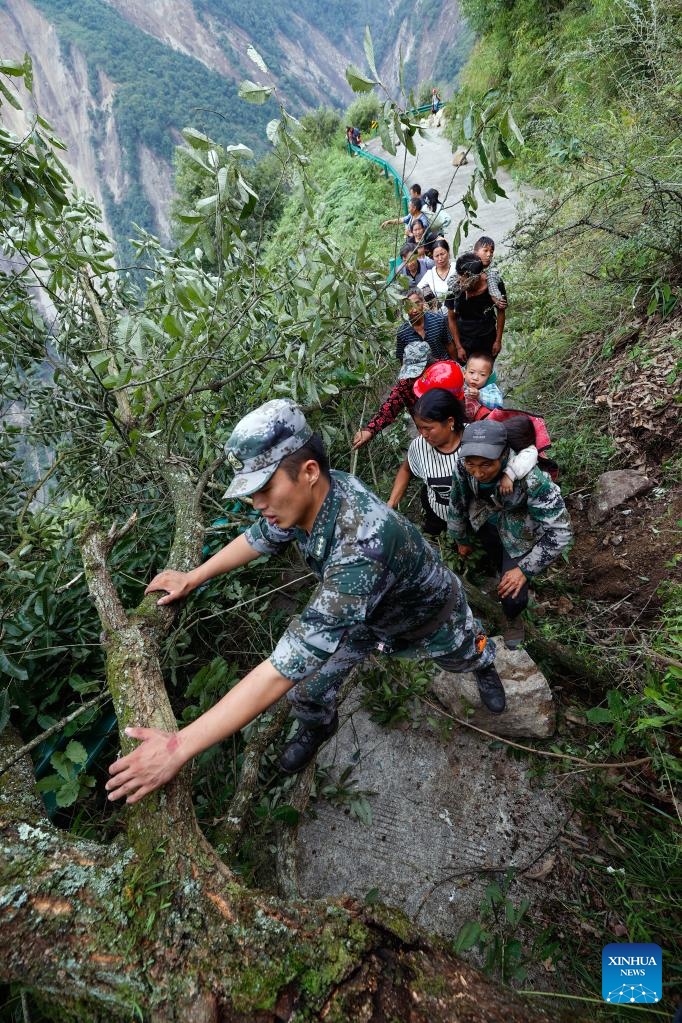 Villagers are evacuated from Wandong Village of Detuo Town in Luding County, southwest China's Sichuan Province, Sept. 6, 2022.