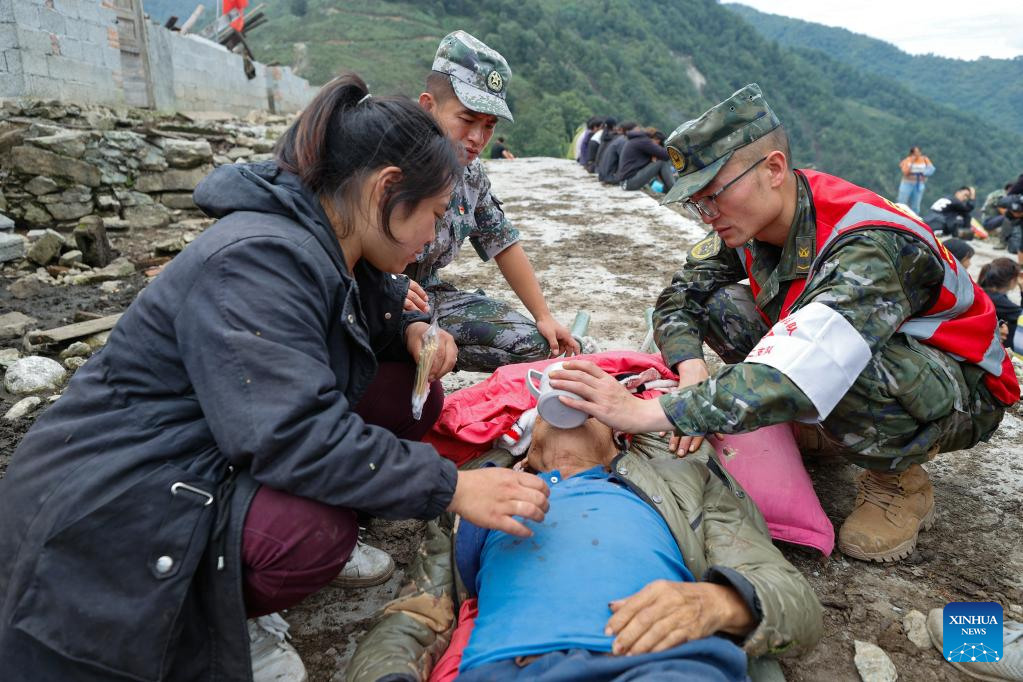 Rescuers feed water to an injured resident evacuated from Detuo Town, in Luding County, southwest China's Sichuan Province, Sept. 6, 2022.