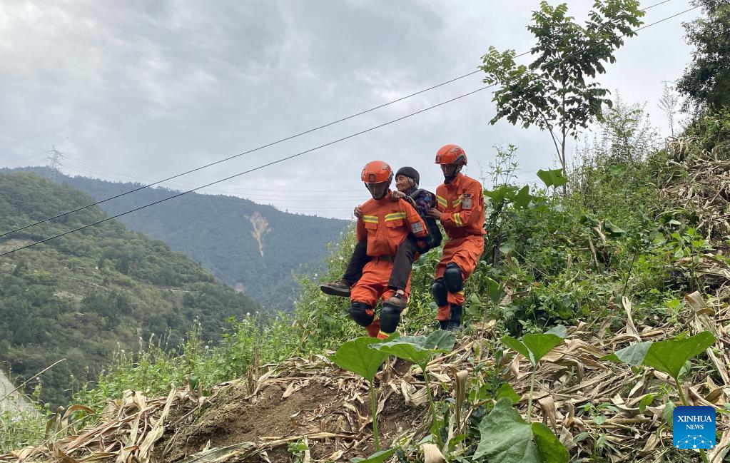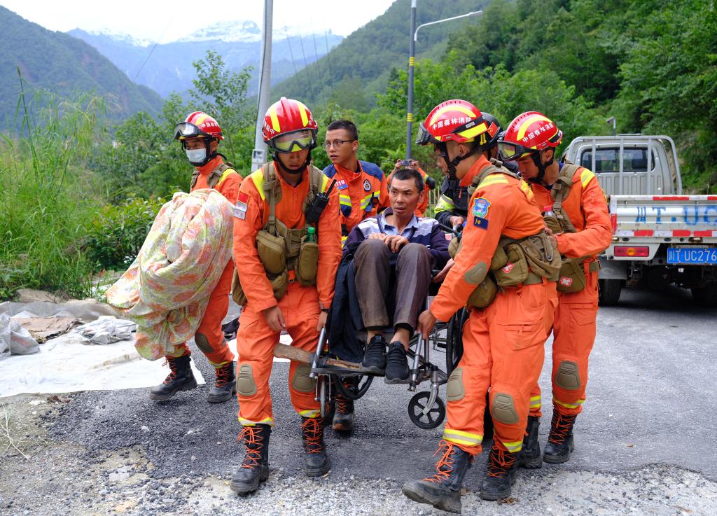 Rescuers transfer quake-affected residents in Detuo Town of Luding County, southwest China's Sichuan Province, Sept. 6, 2022.