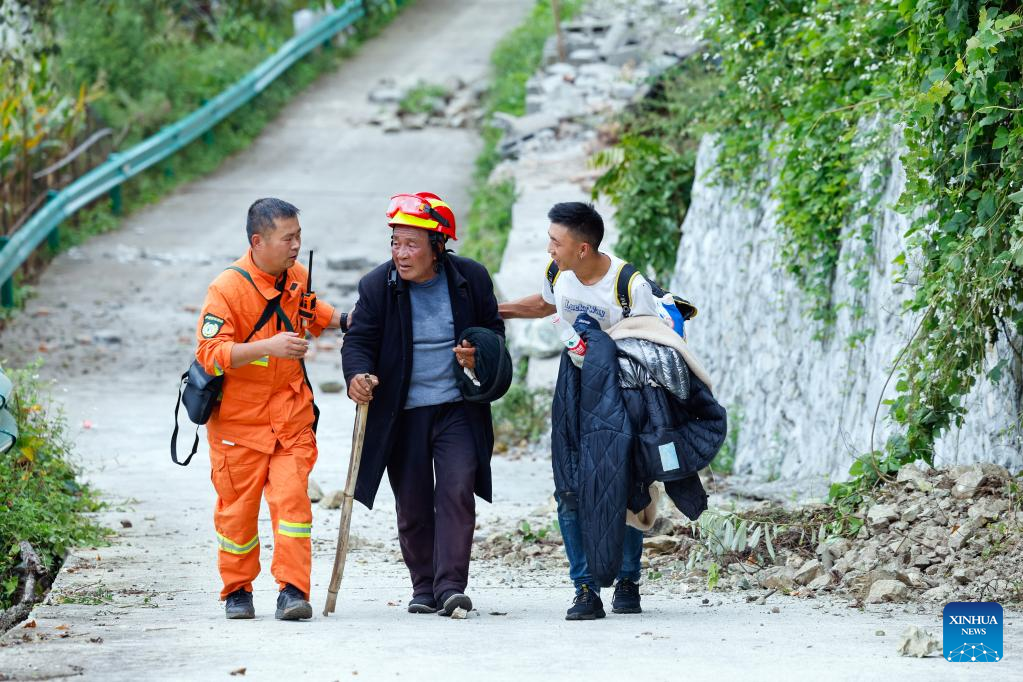 Rescuers accompany a quake-affected resident evacuated from Detuo Town in Luding County, southwest China's Sichuan Province, Sept. 6, 2022.