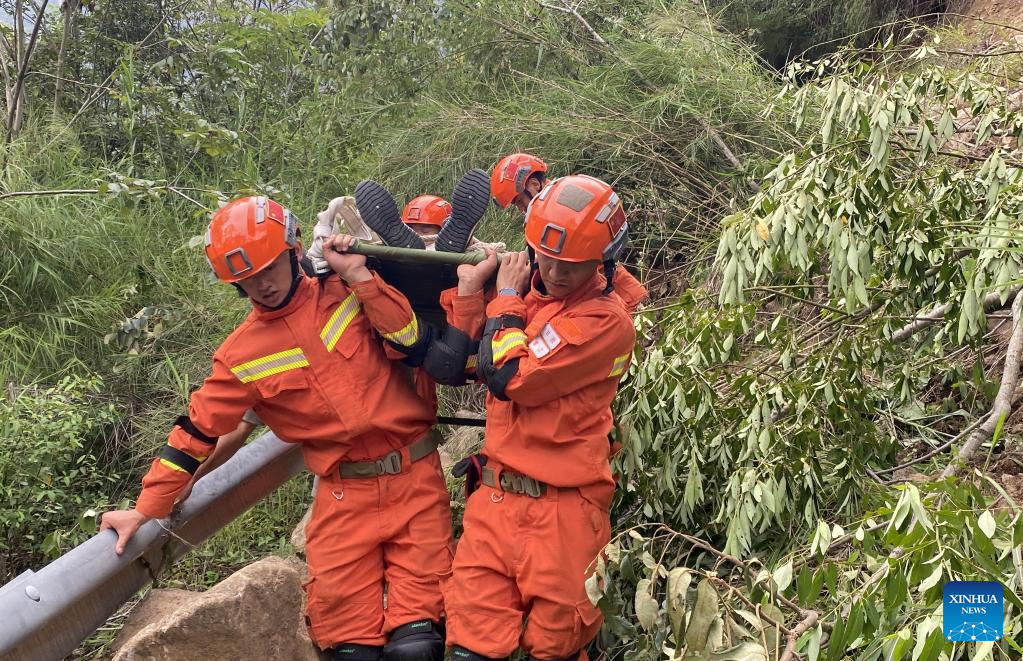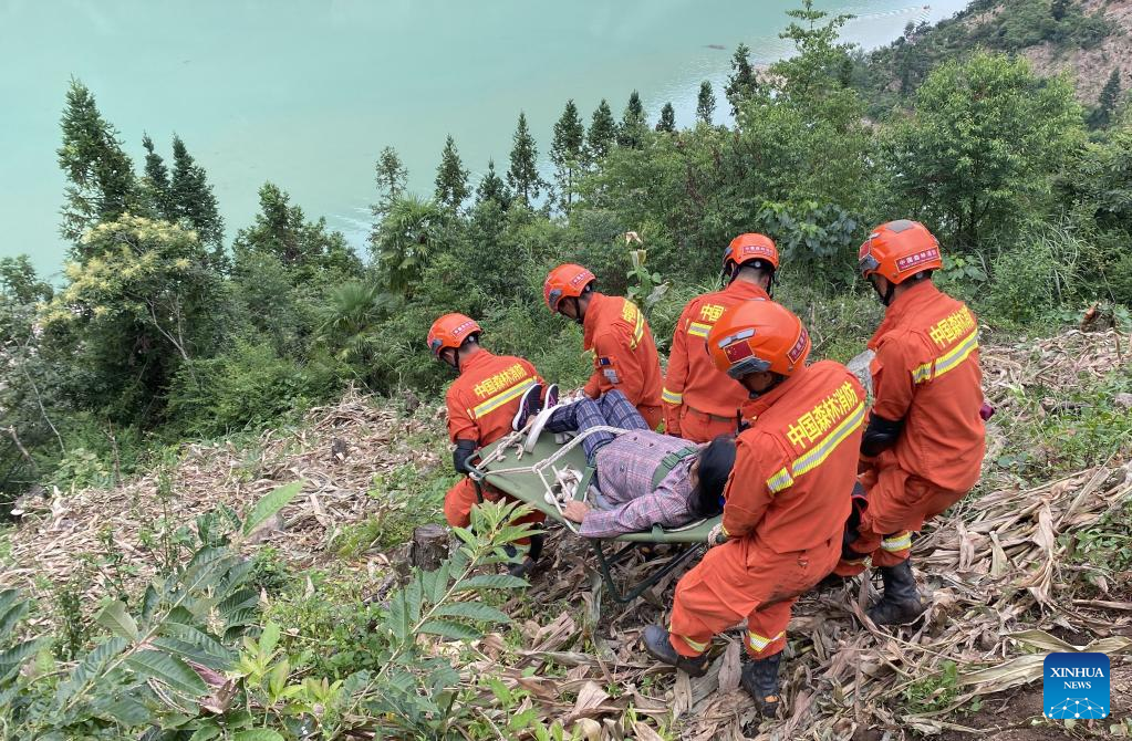 Rescuers transfer an injured villager from Wandong Village of Detuo Town in Luding County, southwest China's Sichuan Province, Sept. 6, 2022.