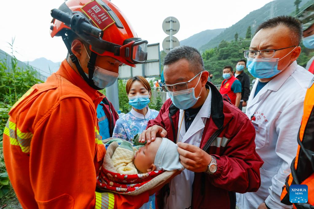Rescuer Zhang Zili hands a 2-month-old infant to the doctors after the baby was evacuated from Wandong Village of Detuo Town, in Luding County, southwest China's Sichuan Province, Sept. 6, 2022.