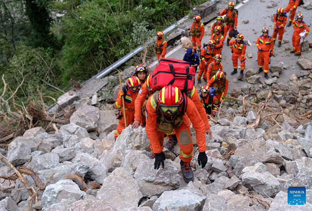 Rescuers head to a quake-hit area in Gonghe Village of Moxi Town in Luding County, southwest China's Sichuan Province, Sept. 6, 2022.