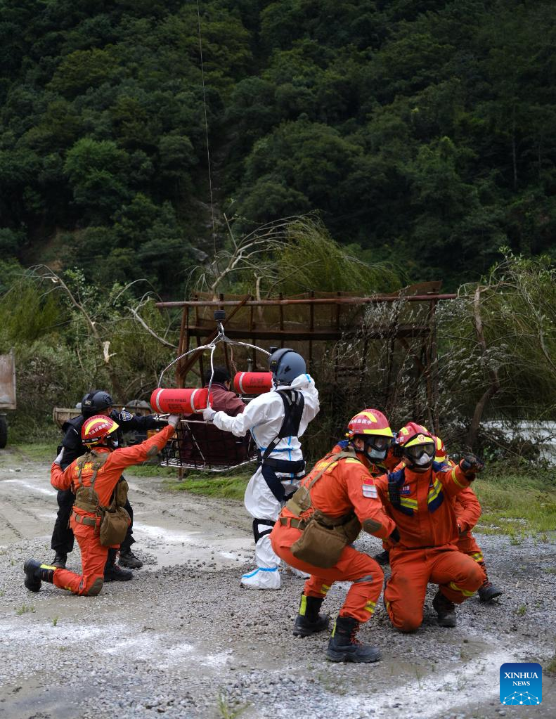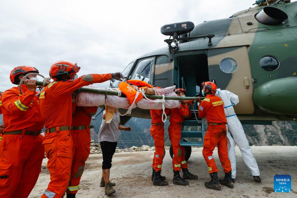 Rescuers transfer injured villagers evacuated from Wandong Village of Detuo Town, in Luding County, southwest China's Sichuan Province, Sept. 6, 2022.