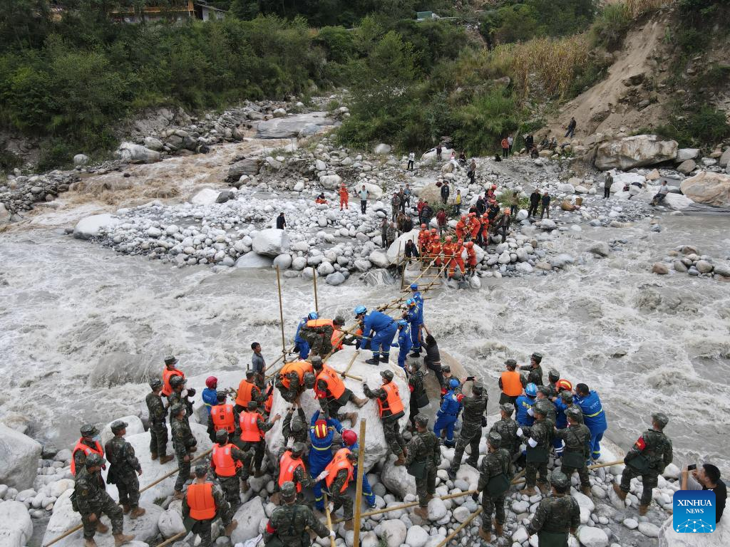Rescuers build a bridge linking to Mozigou Village in Moxi Town of Luding County, southwest China's Sichuan Province, Sept. 6, 2022.
