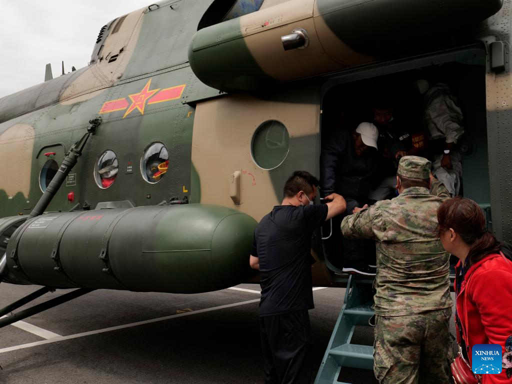 Quake-affected residents are transferred via a helicopter in Luding County, southwest China's Sichuan Province, Sept. 6, 2022.