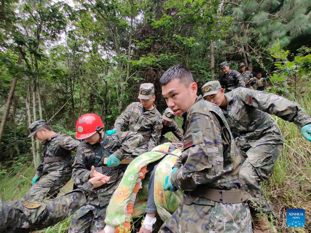 Rescuers transfer an injured villager evacuated from Wandong Village of Detuo Town, in Luding County, southwest China's Sichuan Province, Sept. 6, 2022.
