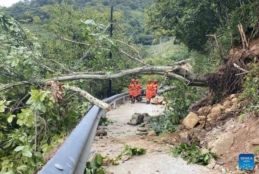 Rescuers walk in Gonghe Village of Moxi Town in Luding County, southwest China's Sichuan Province, Sept. 6, 2022.
