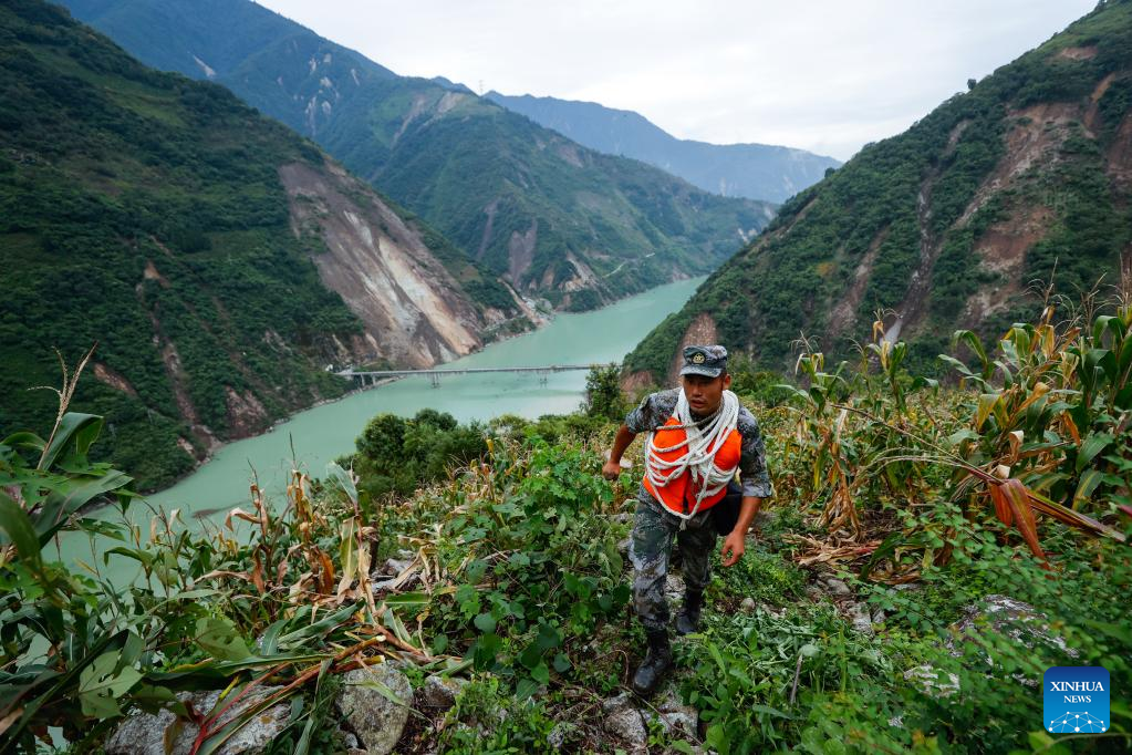 A rescuer walks to Wandong Village of Detuo Town in Luding County, southwest China's Sichuan Province, Sept. 6, 2022.