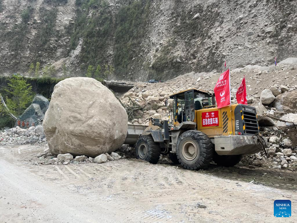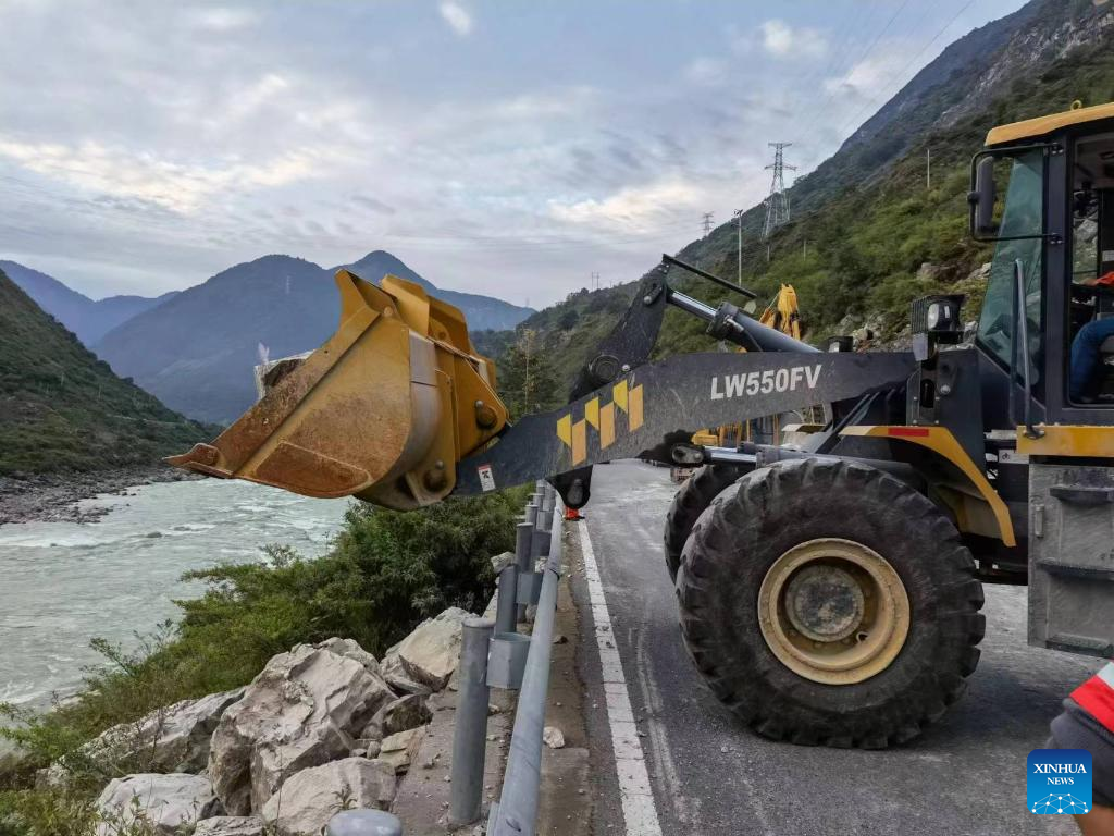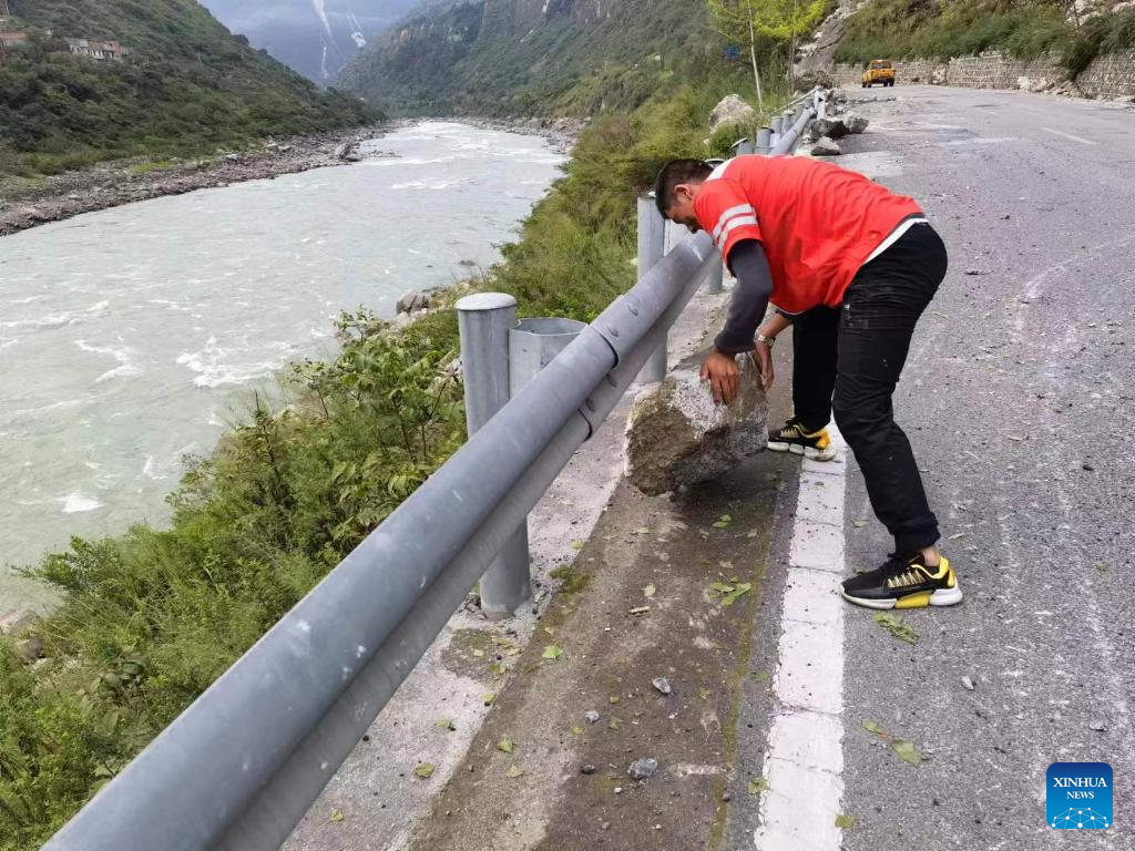 A worker removes a rock from the S217 provincial highway after an earthquake in Luding County of southwest China's Sichuan Province, on Sept. 6, 2022. A 6.8-magnitude earthquake jolted Luding County on Monday. Rescuers have been organized to restore and maintain damaged road access. (Xinhua)
