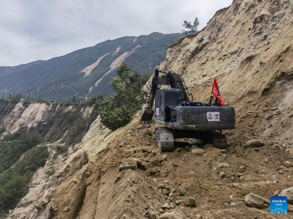 A rescuer operates an engineering vehicle to restore a road linking Moxi Town and the county seat of Luding, southwest China's Sichuan Province, Sept. 6, 2022. A 6.8-magnitude earthquake jolted Luding County on Monday. Rescuers have been organized to make every effort to restore the roads leading to the epicenter. (Xinhua)