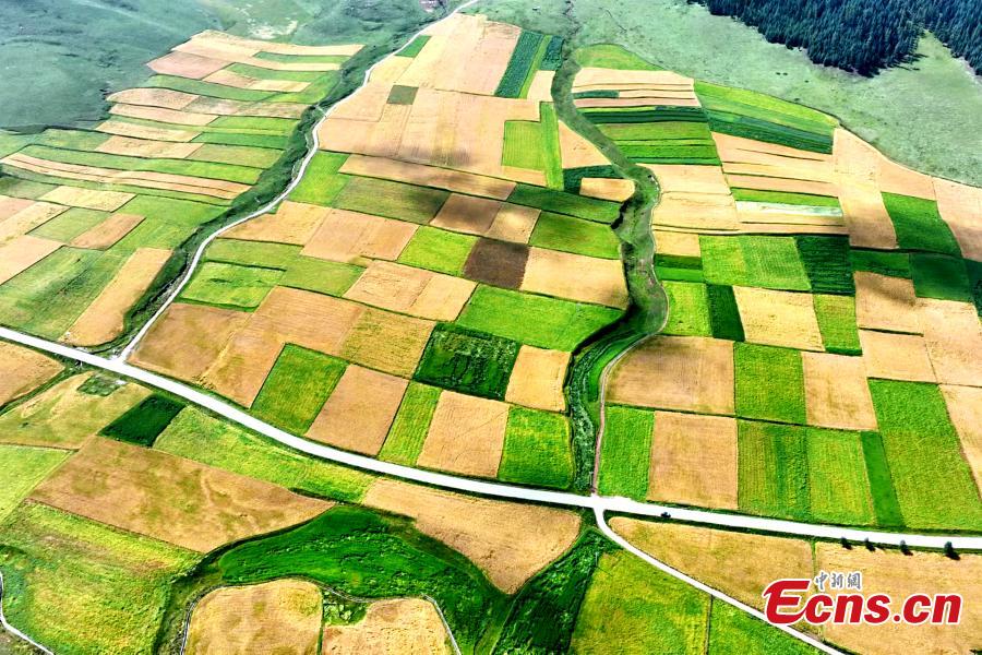 Autumn settles over the Qilian Mountains, Qilian county in Haibei Tibetan autonomous prefecture, Northwest China's Qinghai Province. Golden fields and green grasslands created an unique autumn scenery. (Photo: China News Service/Yang Chunli)