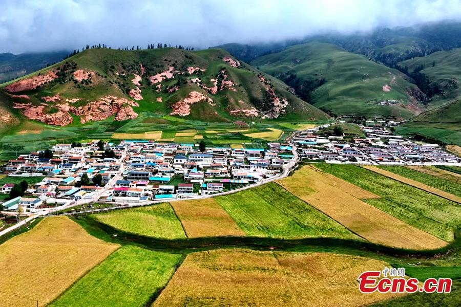 Autumn settles over the Qilian Mountains, Qilian county in Haibei Tibetan autonomous prefecture, Northwest China's Qinghai Province. Golden fields and green grasslands created an unique autumn scenery. (Photo: China News Service/Yang Chunli)