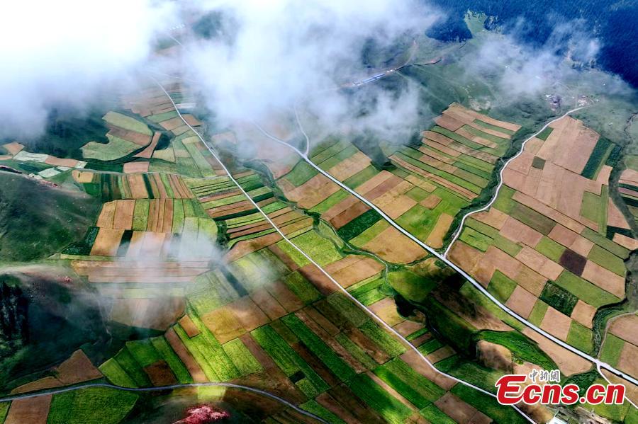 Autumn settles over the Qilian Mountains, Qilian county in Haibei Tibetan autonomous prefecture, Northwest China's Qinghai Province. Golden fields and green grasslands created an unique autumn scenery. (Photo: China News Service/Yang Chunli)