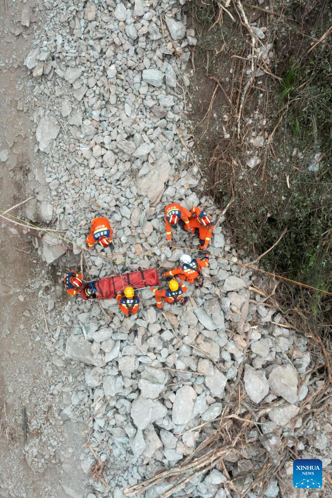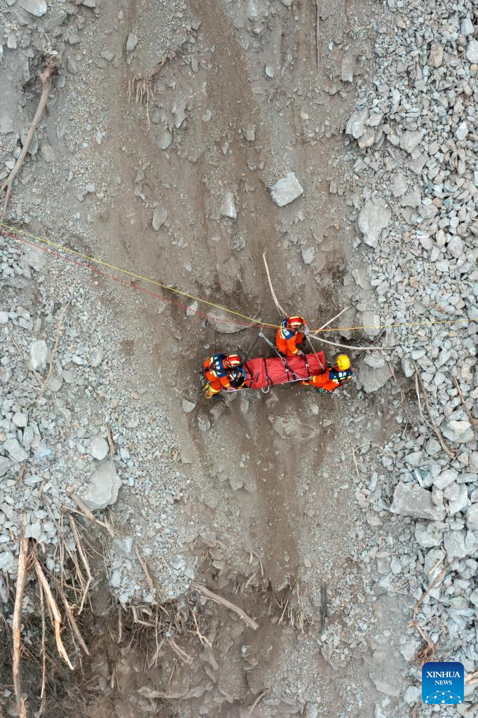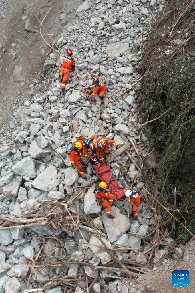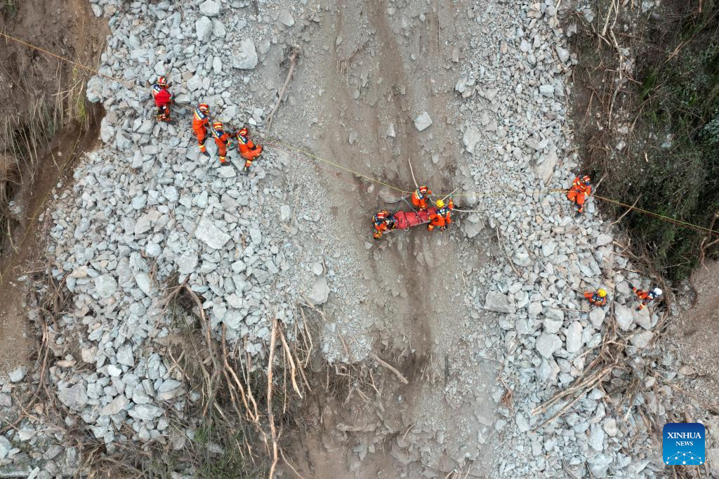 Rescuers transfer an earthquake-affected person near Moxi Town of Luding County, southwest China's Sichuan Province, Sept. 7, 2022. (Xinhua/Shen Bohan)