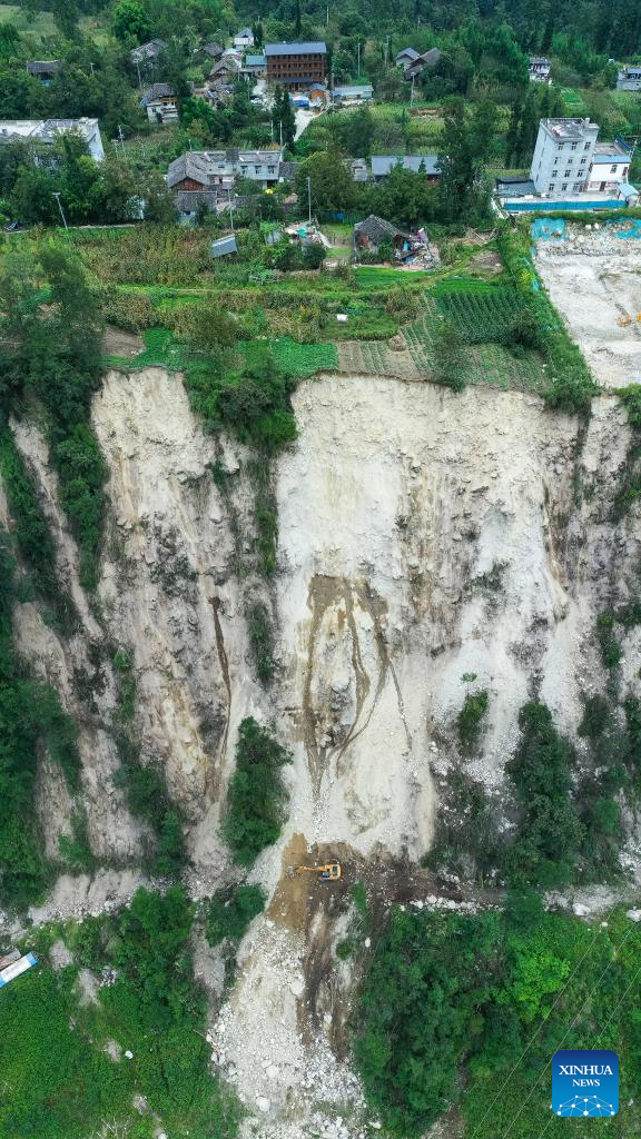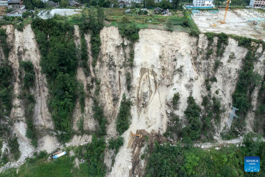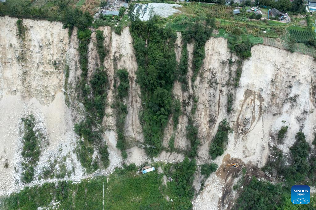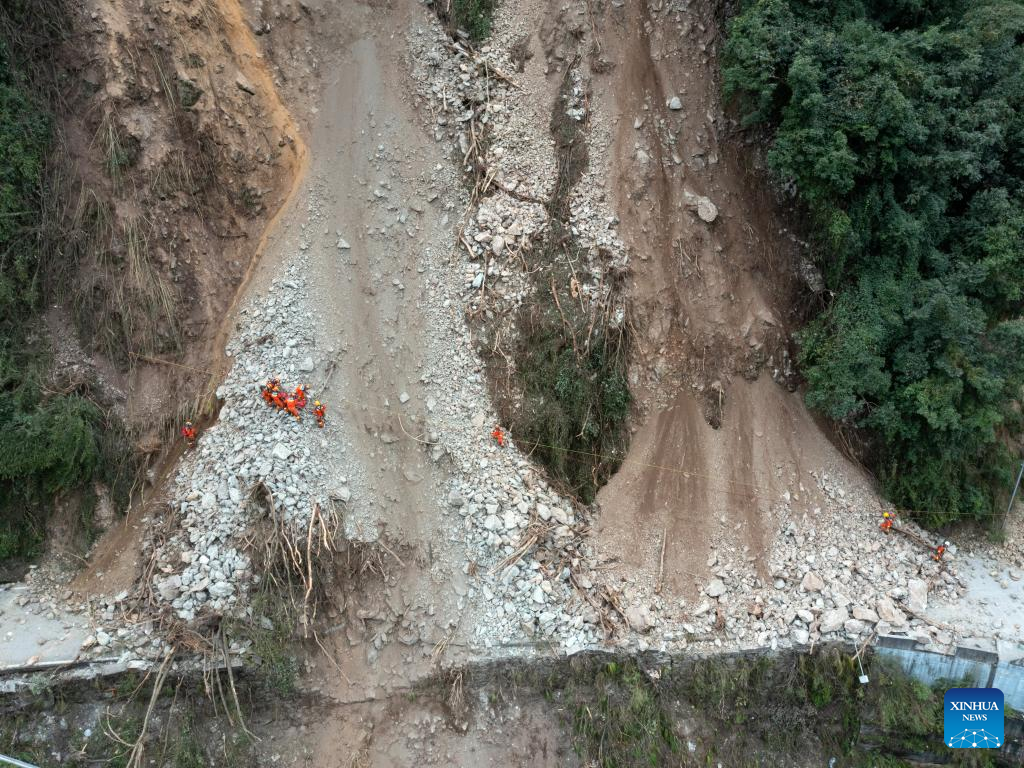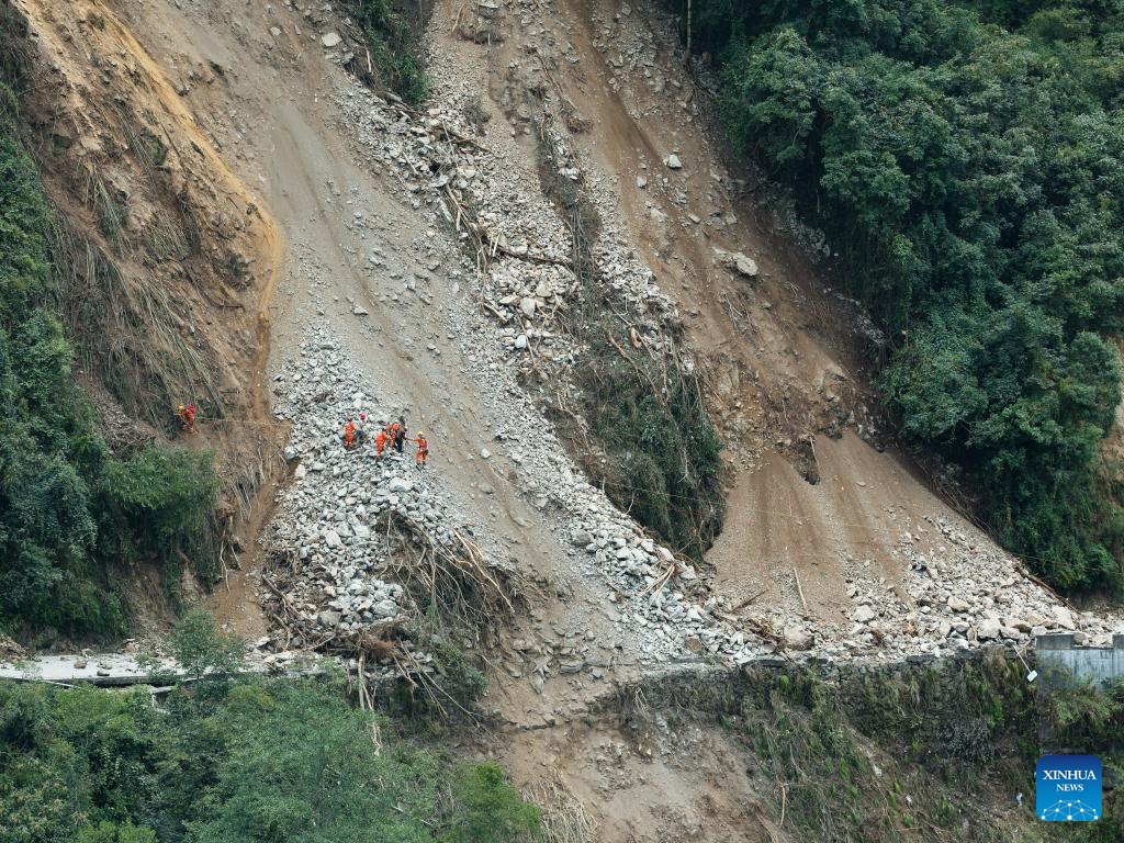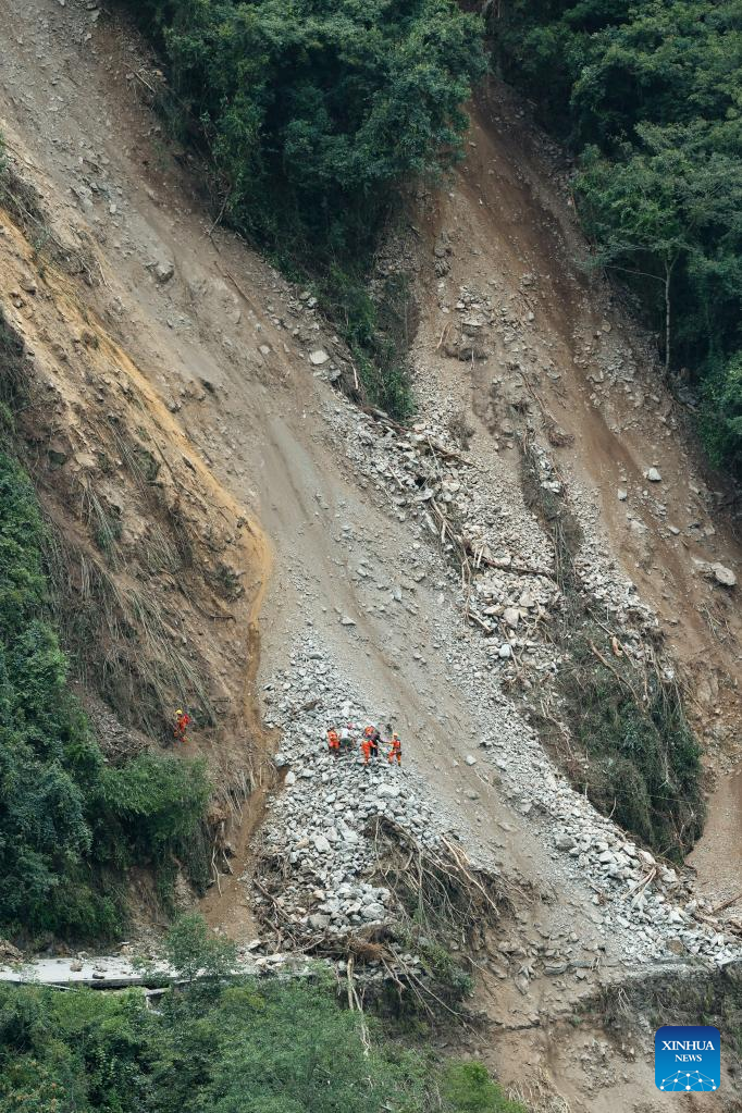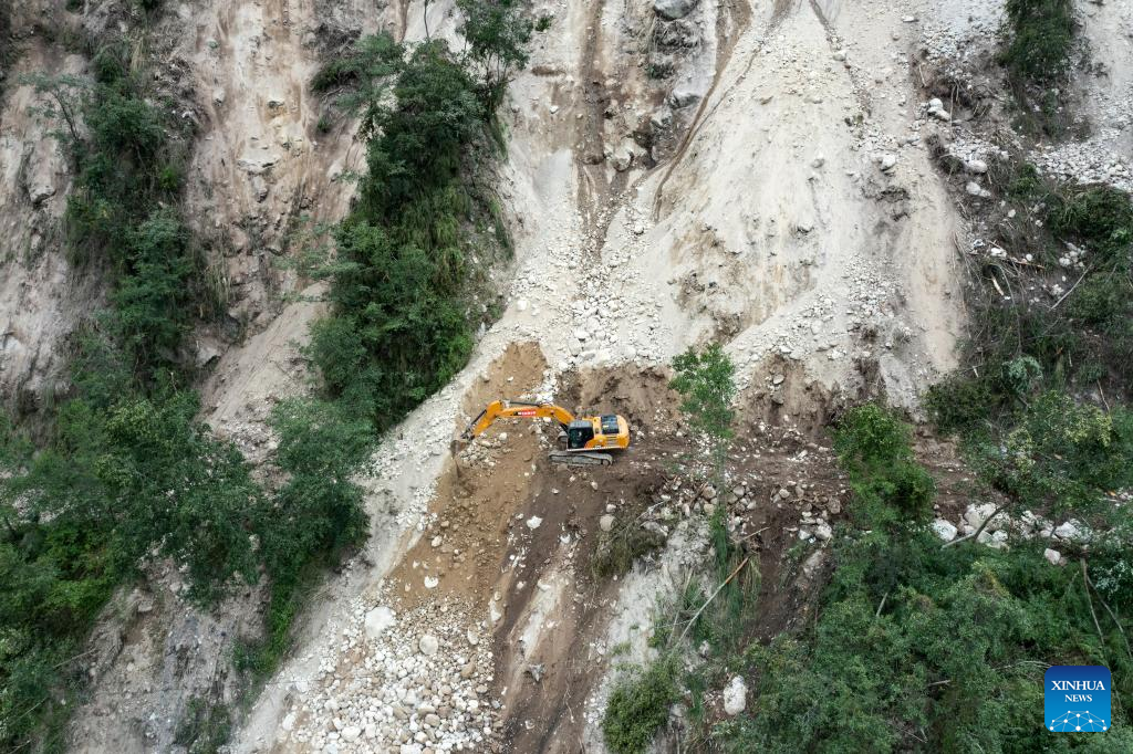 Aerial photo shows rescue workers fixing a road linking to Hailuogou scenic area around Moxi Town of Luding County, southwest China's Sichuan Province, Sept. 7, 2022. (Xinhua/Shen Bohan)