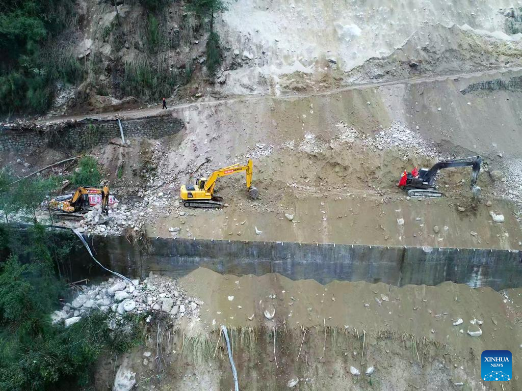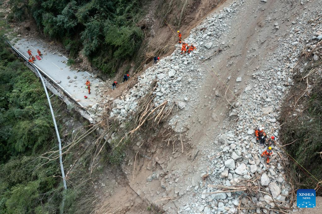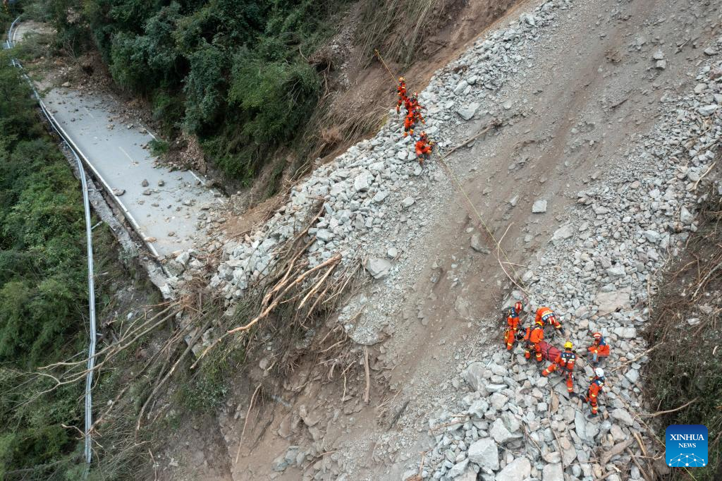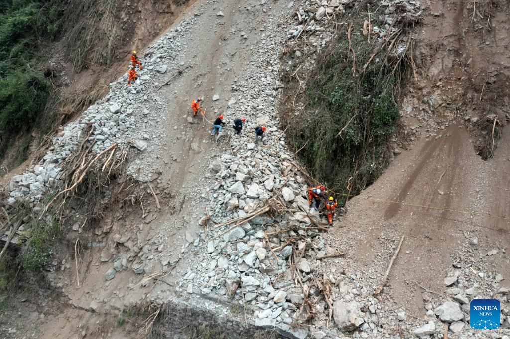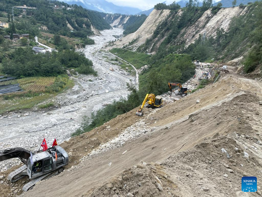 Rescue workers fix a road linking to Hailuogou scenic area around Moxi Town of Luding County, southwest China's Sichuan Province, Sept. 7, 2022. (Xinhua)
