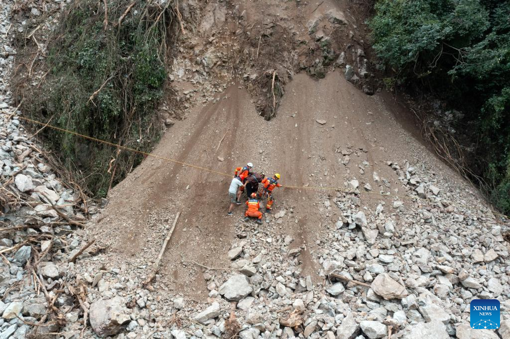 Rescuers transfer earthquake-affected people near Moxi Town of Luding County, southwest China's Sichuan Province, Sept. 7, 2022. (Xinhua/Shen Bohan)