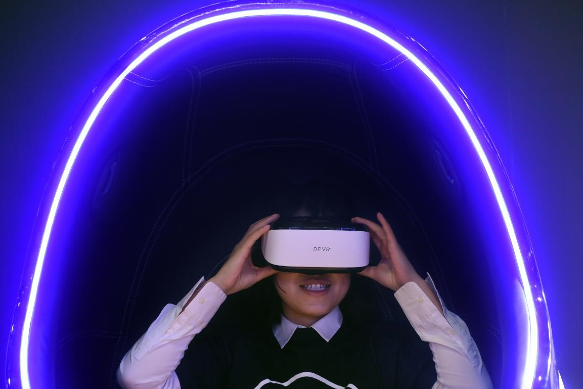 A woman experiences virtual-reality skiing at the 18th Optics Valley of China International Optoelectronic Exposition and Forum held at the China Optics Valley Convention & Exhibition Center, Wuhan, central China's Hubei province, Oct. 27, 2021. (People's Daily Online/Zhou Chao)