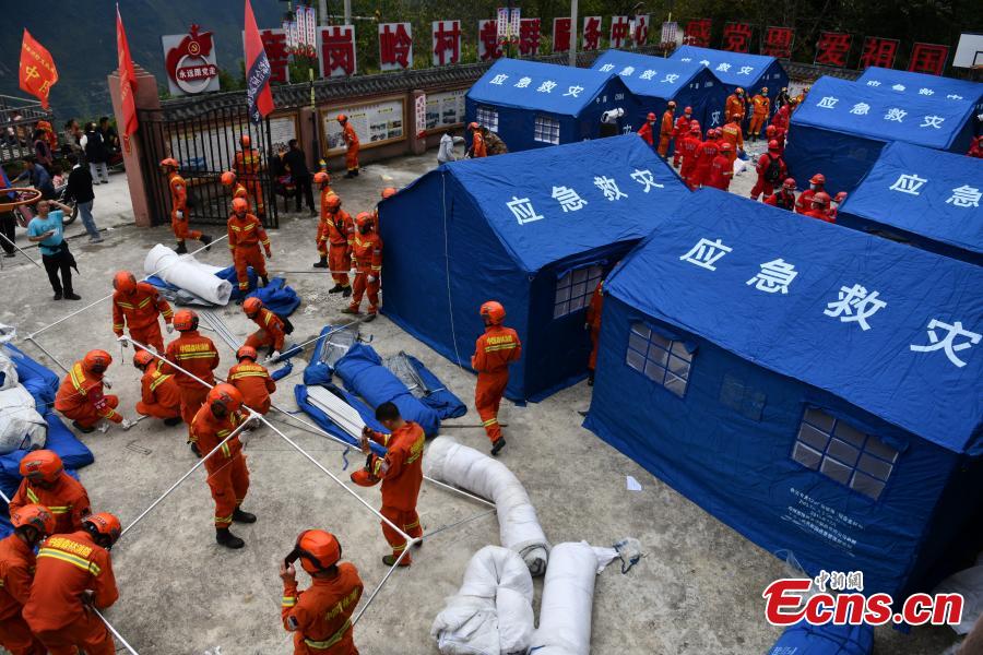 Rescuers put up tents at Moxi town of Luding county in Ganzi Tibetan autonomous prefecture, southwest China's Sichuan Province, Sept. 7, 2022. (Photo: China News Service/Zhang Lang)